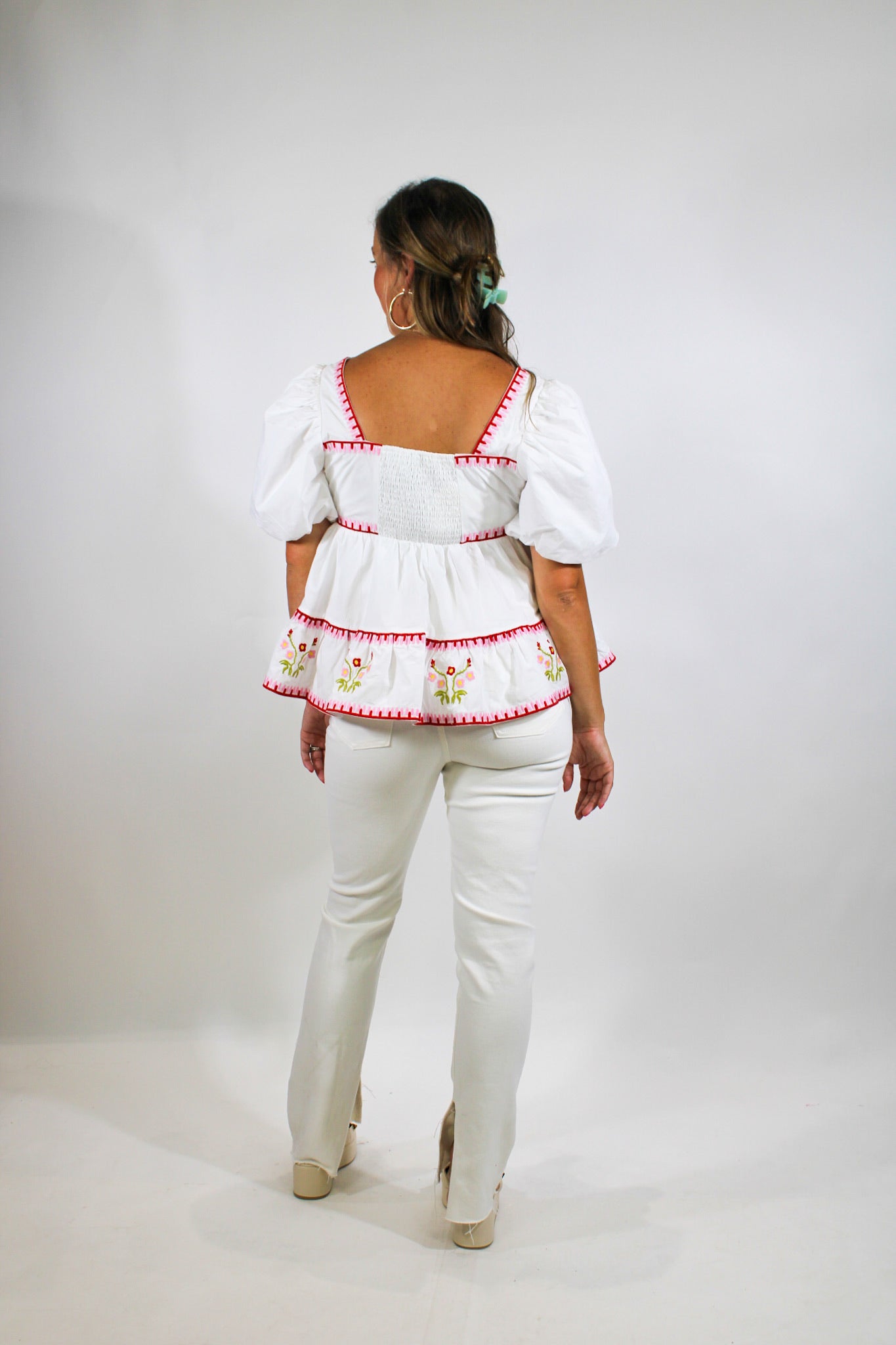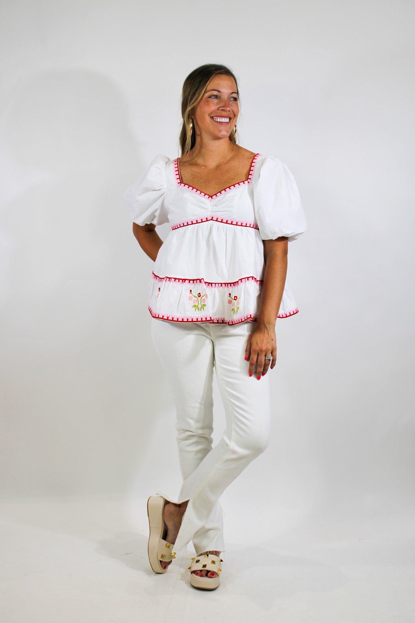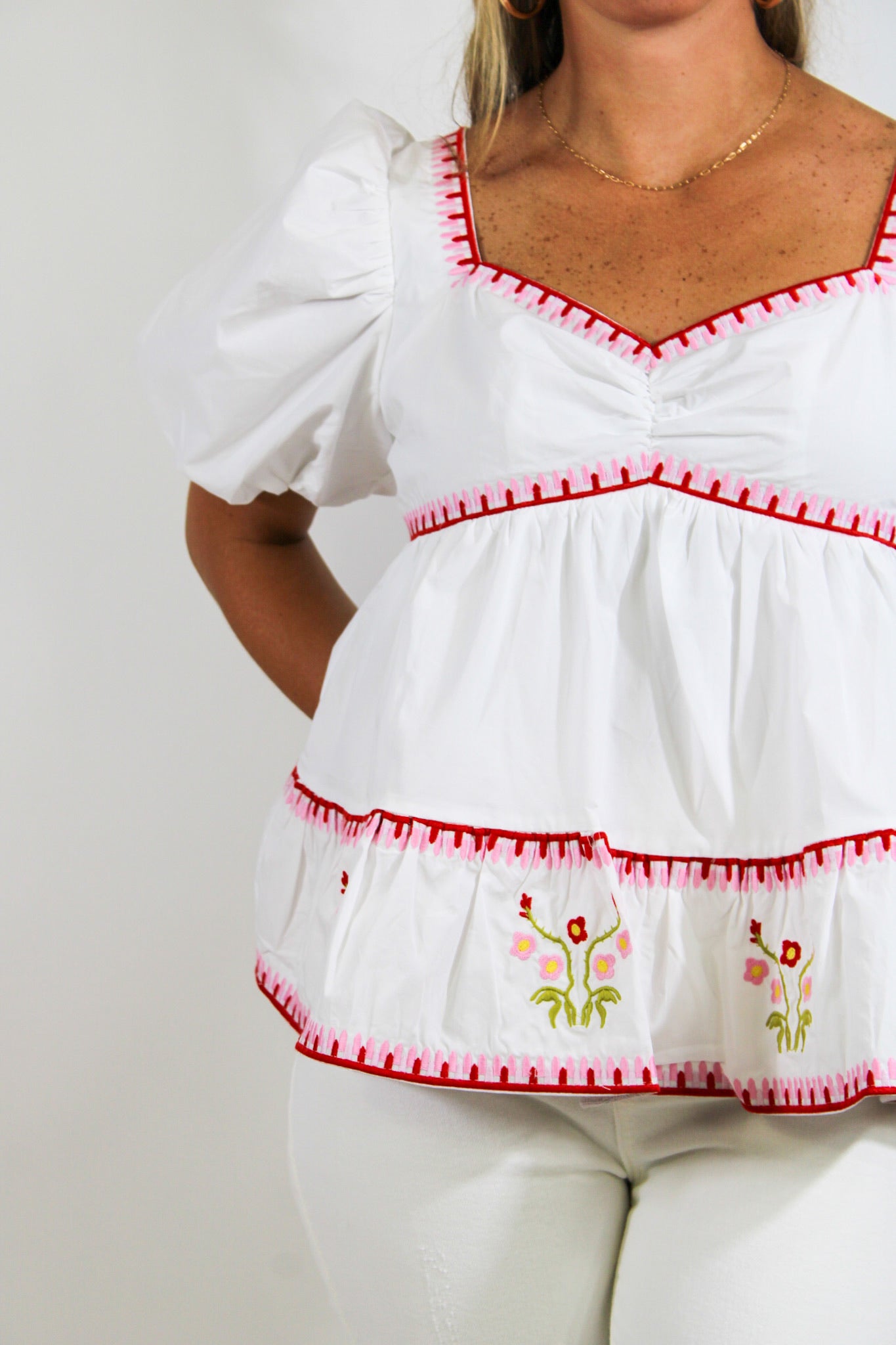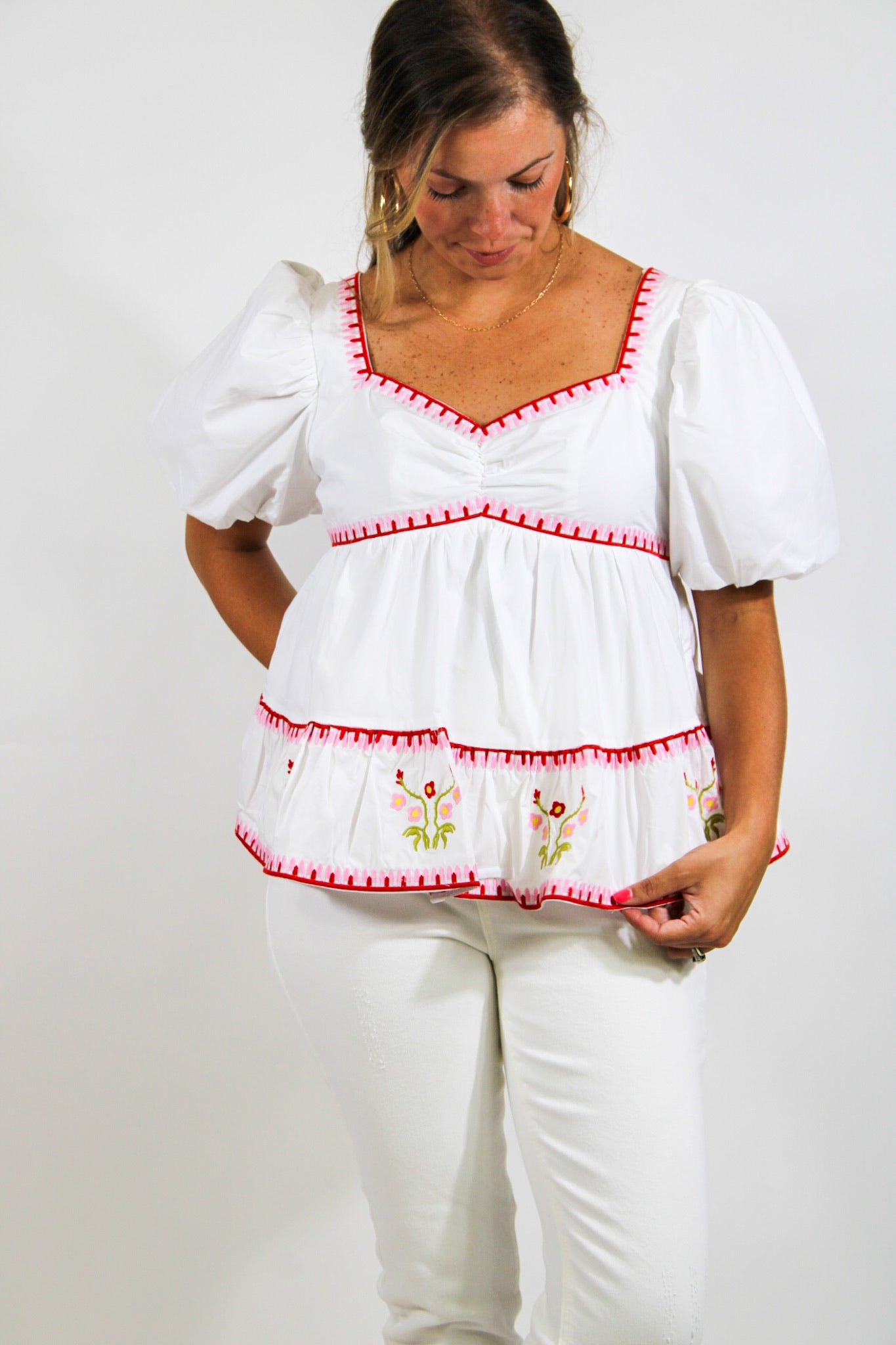 Molly is a 5’4 wearing a size small.-White & Rose Top-Embroidered-True To Size